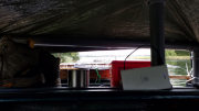 Kormány helyen, ebéd. Egész nap egy hely üresedett meg a szárazföldi oldalon. Sajnos mire összepakoltam és a motort beindítottam elfoglalta egy másik hajó.